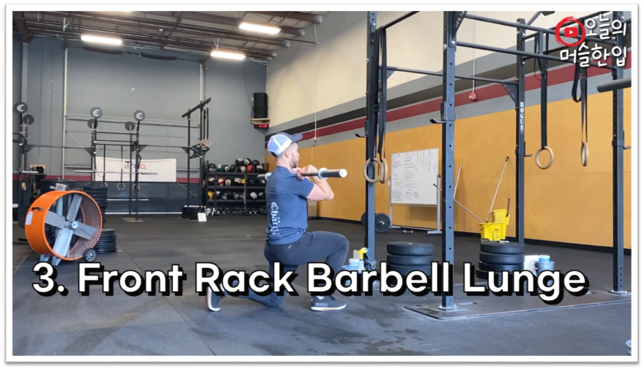 세 번째는 프런트 바벨 런지입니다. 사실 프런트 런지는 중심축이 앞으로 이동했다가 돌아오는 방식이기 때문에 초중급자에게는 다소 어려울 수 있습니다. 그래서 리버스 런지로 안정적으로 자극을 먼저 익힌 후에 프론트를 하시는 것을 추천 드립니다. 아무래도 순간적인 힘과 탄력을 향상시키기 위해 운동선수로써 중량을 이용한 프론트 런지를 하는 것 같습니다.